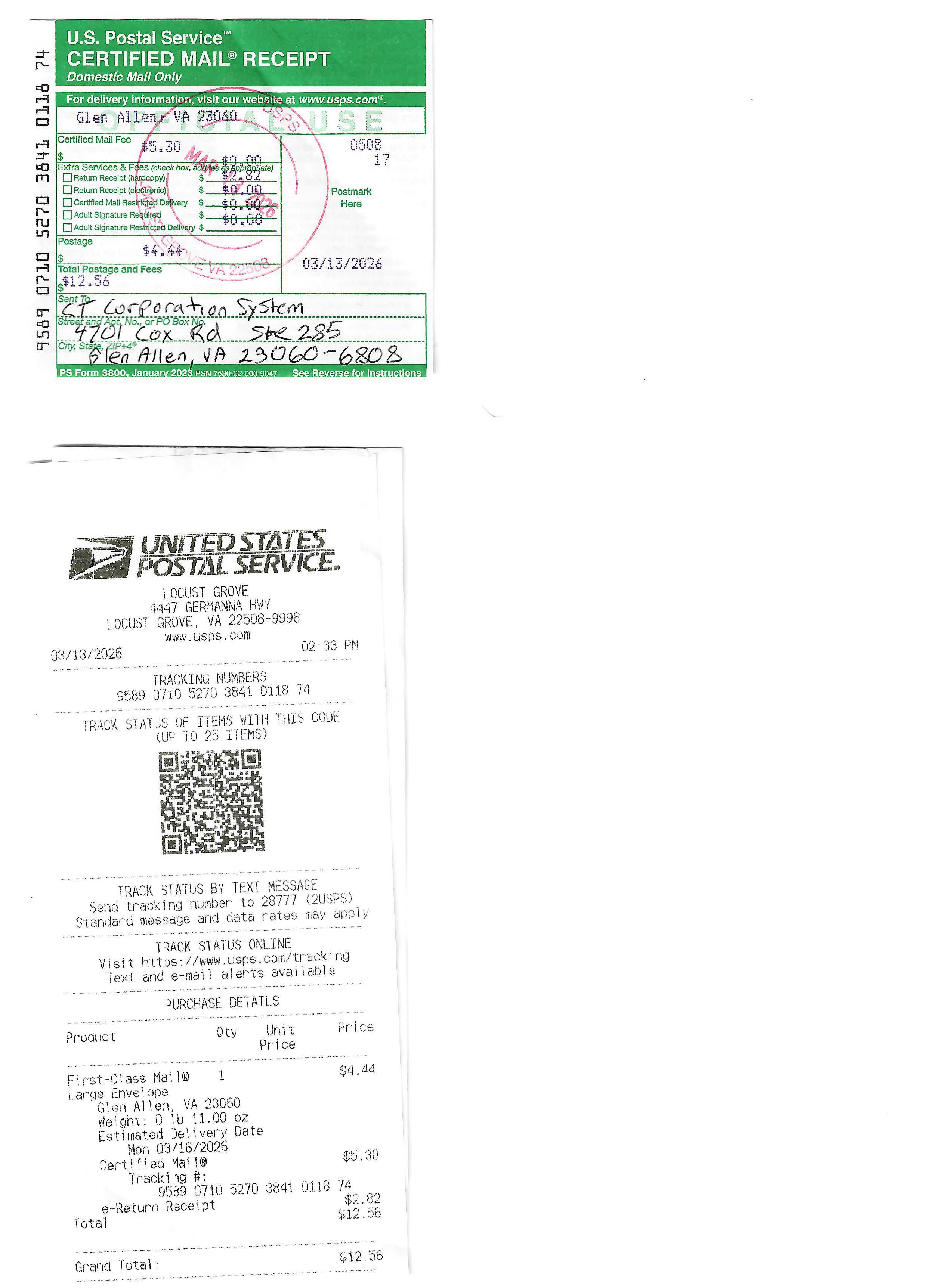 Thank you so much Orange Citizens for filling out those no-trespass notices at the Land Grab seminar this week and actually trusting our ragtag crew to get them certified-mailed to Valley Link like we promised. We hauled them all to the local post office today and — plot twist — the poor woman behind the counter lit up because she’s been drowning in these exact letters. “A ton,” she said. A. Ton. Bravo, citizens! You’re not just sending mail, you’re apparently running a full-blown postal rebellion. The receipt has the tracking number plus a few different ways you can stalk its journey across the state (because apparently we’re all living in suspense-thriller territory now). For anyone that didn't leave your email address with us, we've attached the scans of the certification receipt and the register receipt — enjoy your very own certified proof that the system is officially getting spammed by all of us. You’re welcome… and thank you for making this fight feel gloriously overwhelming. Note that CT Corporation is the registered corporate agent for Valley Link Transmission Virginia, LLC.